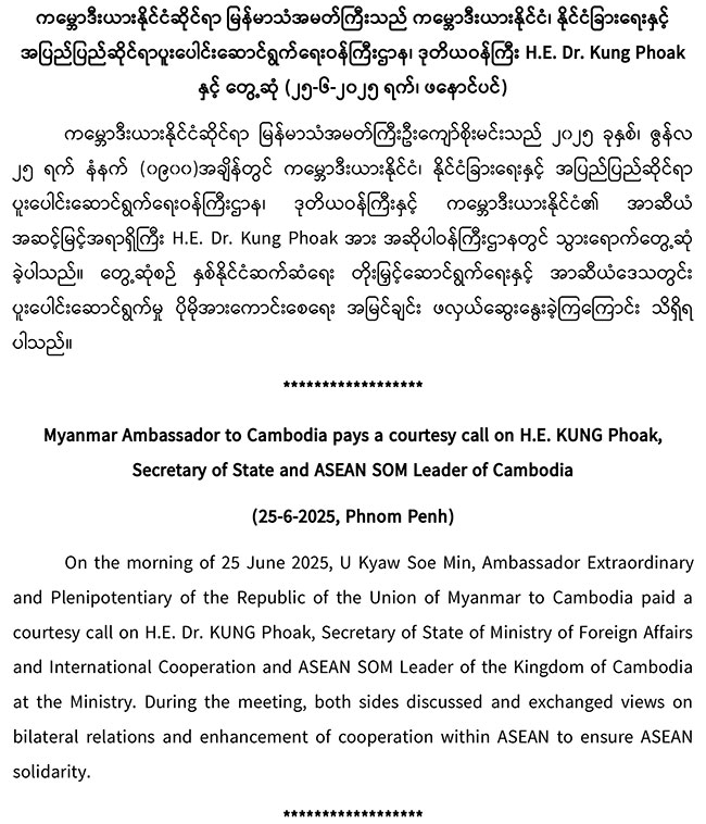 ကမ္ဘောဒီးယားနိုင်ငံဆိုင်ရာ မြန်မာသံအမတ်ကြီးသည် ကမ္ဘောဒီးယားနိုင်ငံ၊ နိုင်ငံခြားရေးနှင့် အပြည်ပြည်ဆိုင်ရာပူးပေါင်းဆောင်ရွက်ရေးဝန်ကြီးဌာန၊ ဒုတိယဝန်ကြီး H.E. Dr. Kung Phoak နှင့် တွေ့ဆုံ (၂၅-၆-၂၀၂၅ ရက်၊ ဖနောင်ပင်) Connect With Us FollowFollowFollowFollowFollowFollowFollowFollow အဂတိလိုက်စားမှုများ တိုင်ကြားရန် TIME Yangon Phnom Penh